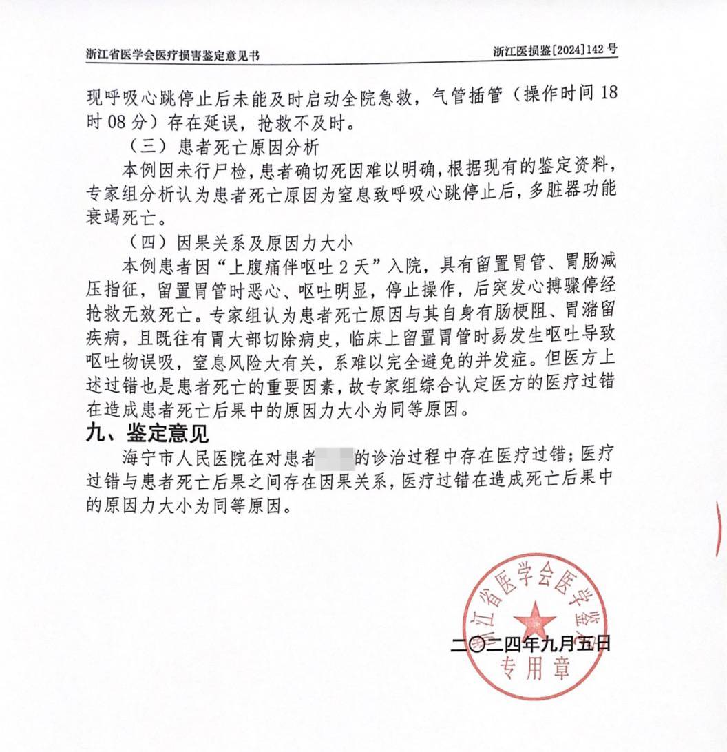 浙江省医学会2024年9月5日出具的医疗挫伤松弛认识书认定:海宁市东说念主民病院在对患者张某的治愈历程中存在医疗瑕疵;医疗瑕疵与患者死一火效果之间存在因果关系,医疗瑕疵在酿成死一火效果中的原因力大小为同等原因。