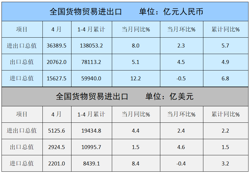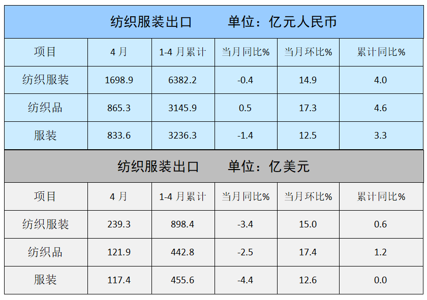 4月,纺织服装出口1698.9亿元,同比着落0.4%,环比增长14.9%,其中纺织品出口865.3亿元,增长0.5%,环比增长17.3%,服装出口833.6亿元,着落1.4%,环比增长12.5%。