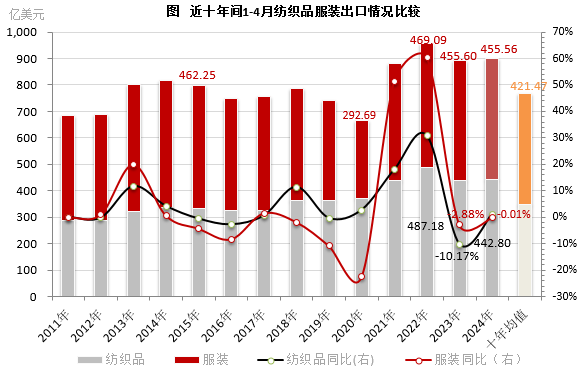 纺织品服装出口按好意思元计:2024年1-4月,纺织服装累计出口898.4亿好意思元,增长0.6%,其中纺织品出口442.8亿好意思元,增长1.2%,服装出口455.6亿好意思元,同比与客岁合手平。