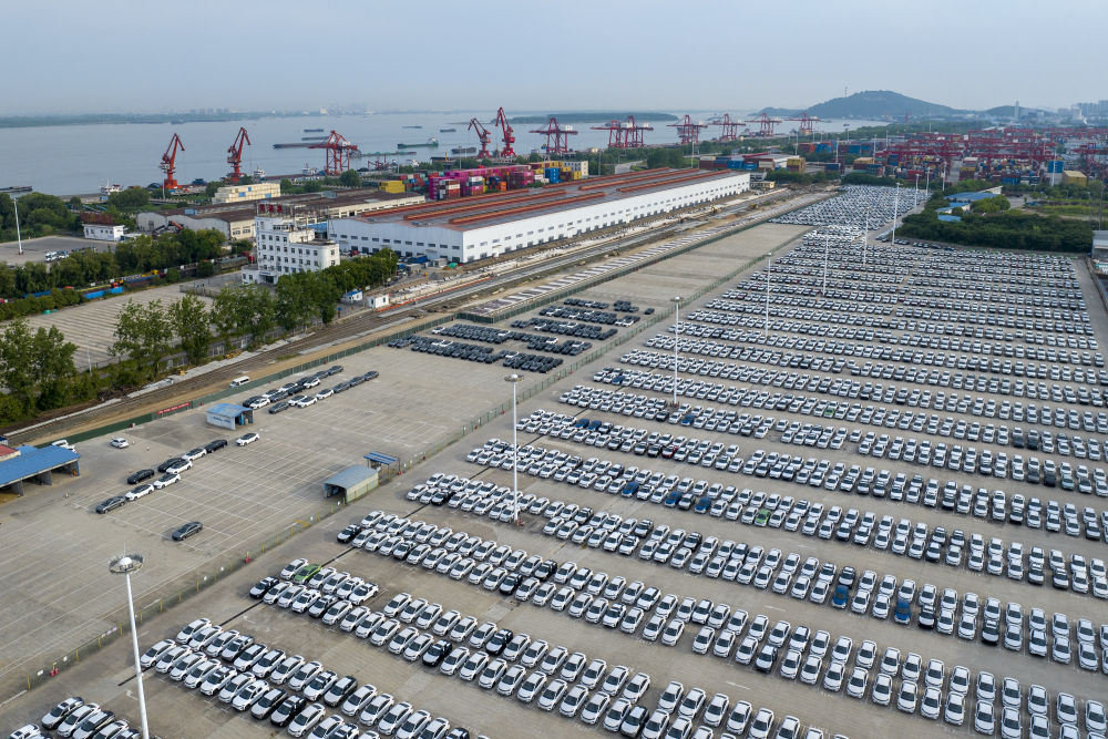5月26日,在安徽芜湖港朱家桥港区海外集装箱船埠,整皆枚举的汽车恭候出口(无东说念主机相片)。 新华社发(肖本祥 摄)