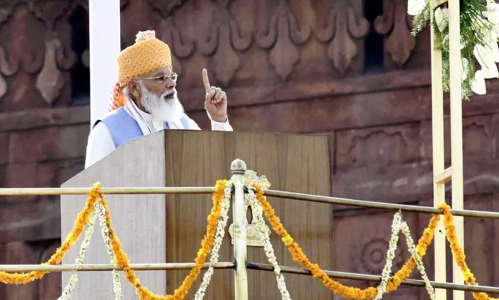 这是印度总理莫迪2021年8月15日在德里举行的独处日庆祝庆典上语言的尊府相片。新华社发(印度新闻局供图)