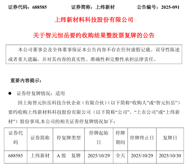 上纬新材(688585)10月29日晚间公告,约束2025年10月28日,上海智元恒岳科技结伴企业(有限结伴)(简称“智元恒岳”)要约收购公司股份期限届满。