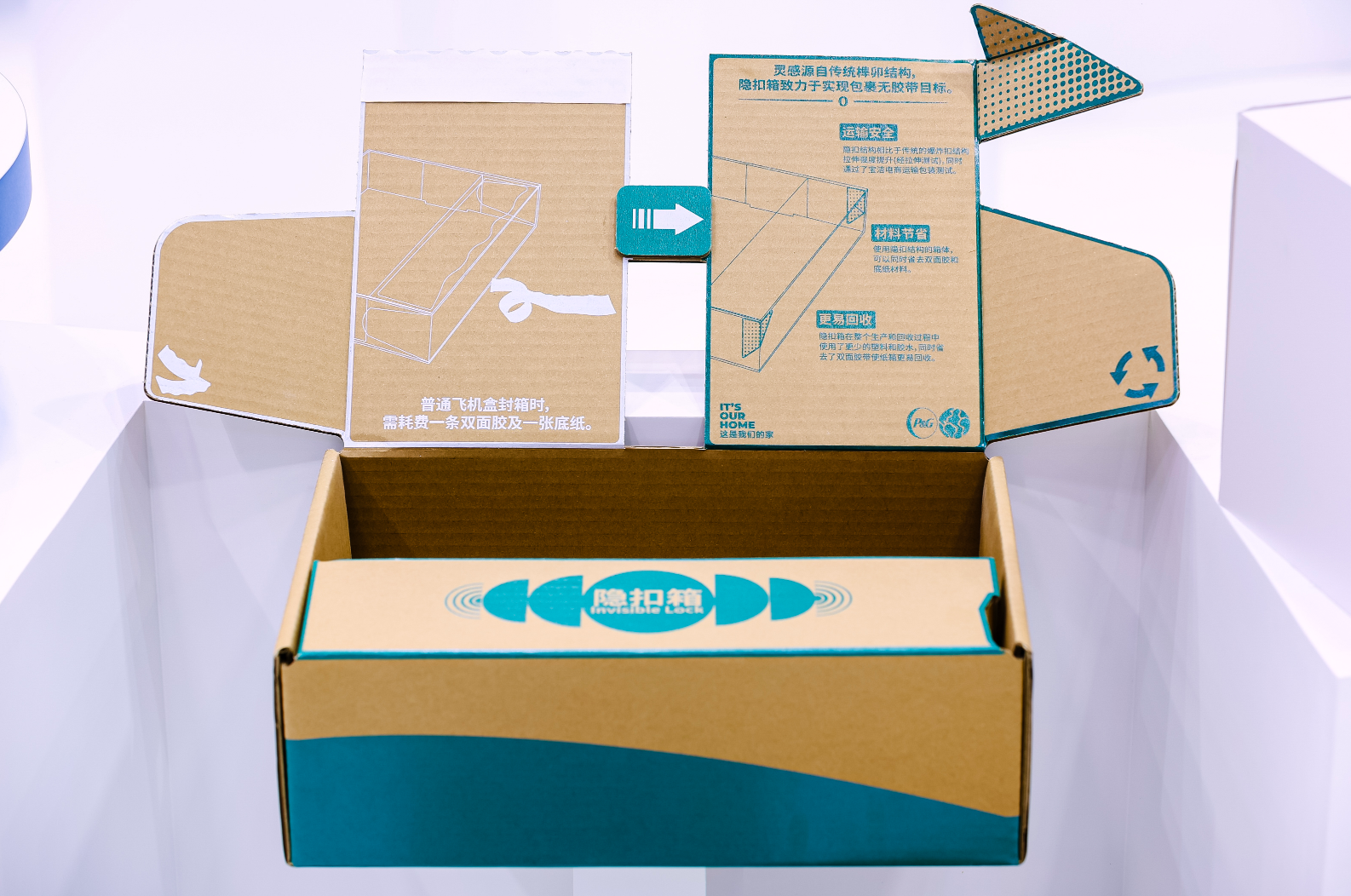 本年进博会现场,宝洁寰球首发隐扣箱,灵感源自传统榫卯结构,减少了胶带的使用,从而提高了纸箱回收的便利性。